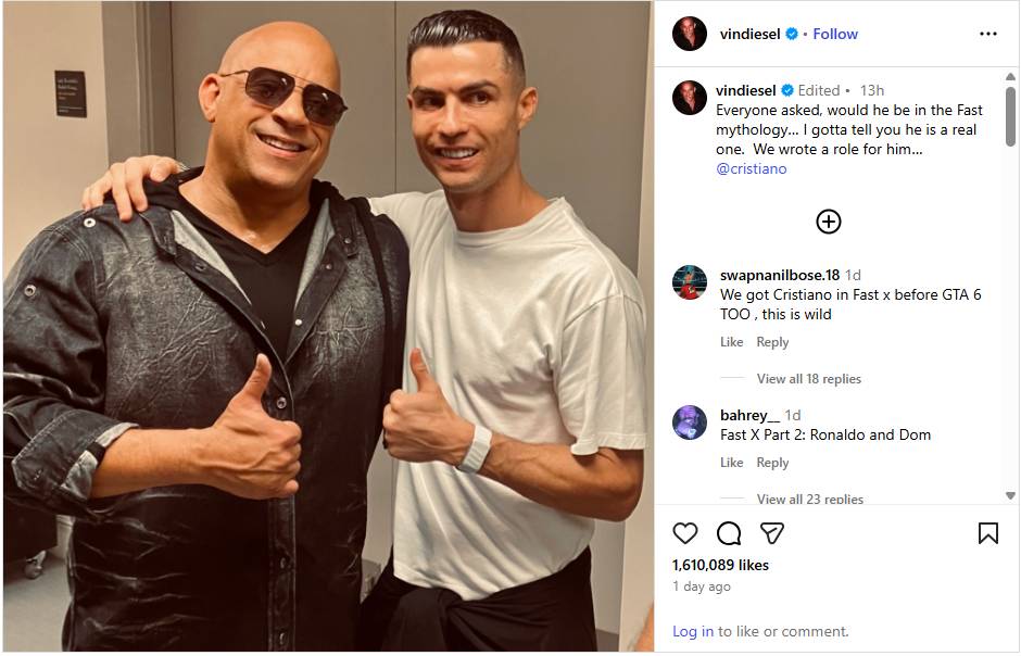 ამერიკელმა მსახიობმა და პროდიუსერმა ვინ დიზელმა აღნიშნა, რომ კრიშტიანუ რონალდუსთვის ახალ "ფორსაჟში" როლი მოიფიქრა.