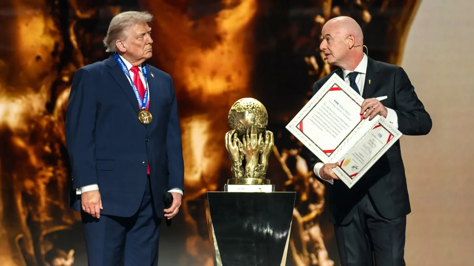 დეკემბერში ფიფამ ტრამპს 2026 წლის მსოფლიო ჩემპიონატის წილისყრის ცერემონიაზე პირველი „მშვიდობის პრიზი“ გადასცა და აღნიშნა, რომ მან „მნიშვნელოვანი როლი ითამაშა“ ისრაელსა და პალესტინელებს შორის ცეცხლის შეწყვეტის დამყარებაში.