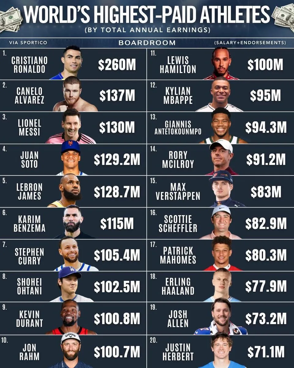 ალვარესმა წელი ასტრონომიული მაჩვენებლით — 137 მილიონი დოლარით დაასრულა, რაც არგენტინელ ვარსკვლავზე 7 მილიონით მეტია. მესის შემოსავალმა 130 მილიონი დოლარი შეადგინა და მან მესამე ადგილზე გადმოინაცვლა.
