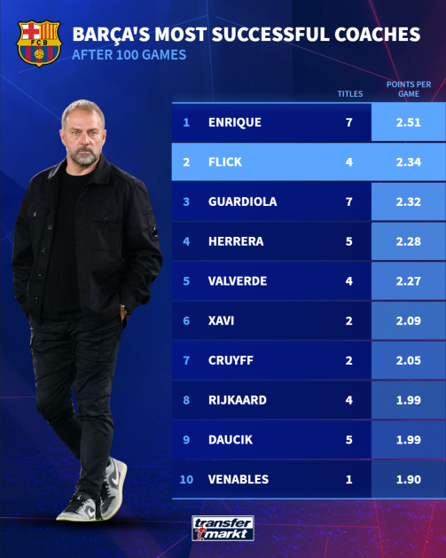 ისტორიაში მხოლოდ ერთადერთ მწვრთნელს, ლუის ენრიკეს ჰქონდა უკეთესი სტარტი პირველ 100 მატჩში (2.51 ქულა).