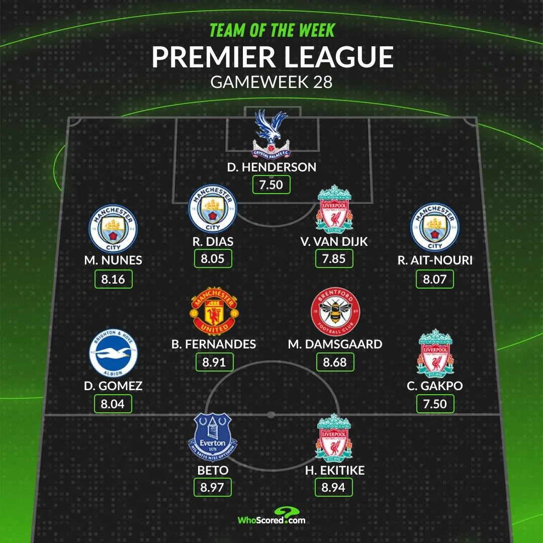 WhoScored-მა პრემიერ ლიგის 28-ე ტურის სიმბოლური ნაკრები გამოაქვეყნა, სადაც რამდენიმე მოულოდნელი გვარი და მაღალი შეფასება დაფიქსირდა.