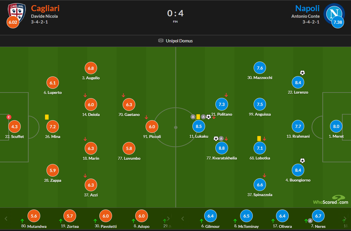 იტალიის სერია ა-ს მე-4 ტურში ნაპოლი კალიარის ესტუმრა და მეტოქე 0-4 გაანადგურა. სასტარტო შემადგენლობაში იყო ხვიჩა კვარაცხელია, რომელმაც მოედანზე 74 წუთი გაატარა, რა დროშიც გოლი და საგოლე გადაცემა მიითვალა.