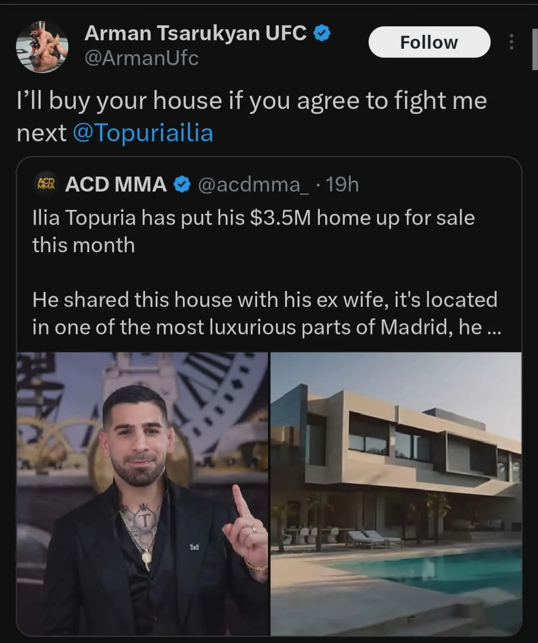 „შენს სახლს ვიყიდი, თუ ჩემთან ჩხუბს დათანხმდები." — ასე მიმართა ცარუკიანმა თოფურიას სოციალურ ქსელ X-ში, რომელიც ადრე Twitter-ით იყო ცნობილი.